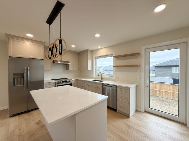 This stunning family home offers a blend of modern design with an ideal location! The custom-built property features an open floor plan and vaulted ceilings on the main floor. The main floor also features a living room with gas fireplace, a white kitchen with quartz countertops, complete with an undermount sink and tiled backsplash, as...