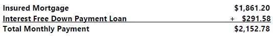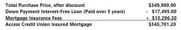 Access Credit Union will provide an insured mortgage and an interest free loan for the down payment of 5% of the purchase price for 5 years.
