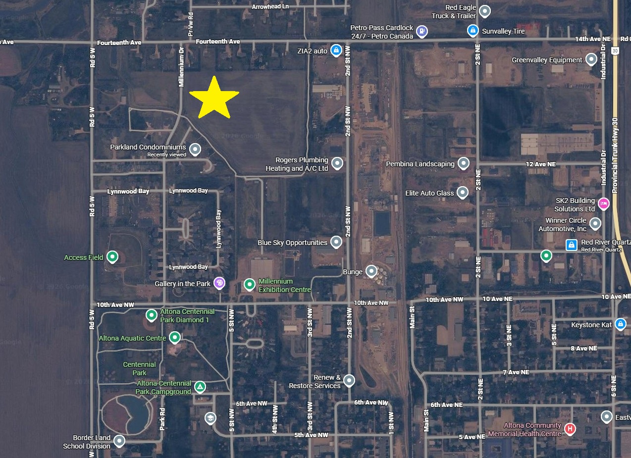 Welcome to Parkland – Phase One, Altona’s newest residential development! Phase One includes 17 serviced residential lots within a welcoming neighbourhood. The development features green space and walking paths and is a short distance to parks, a swimming pool, baseball diamonds, and the Millennium Exhibition Centre. Services expected to be in place Summer 2026. Contact your Realtor today to secure a lot!