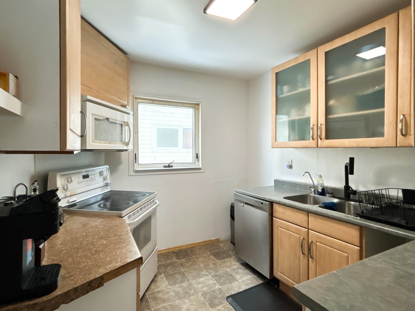 The exterior has newer vinyl siding, low-maintenance vinyl windows, and newer shingles. Other updates include a high-efficiency gas furnace and hot water tank.